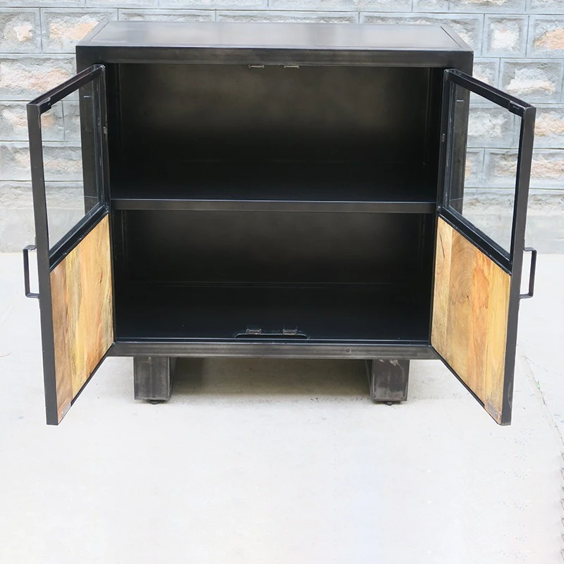 Buffet petit modèle de la collection Jodhpur en métal et bois. Ce buffet dispose de deux portes demi-vitrées avec étagère intérieure pour plus de rangement. Son style résolument moderne apportera une touche industrielle à votre intérieur.