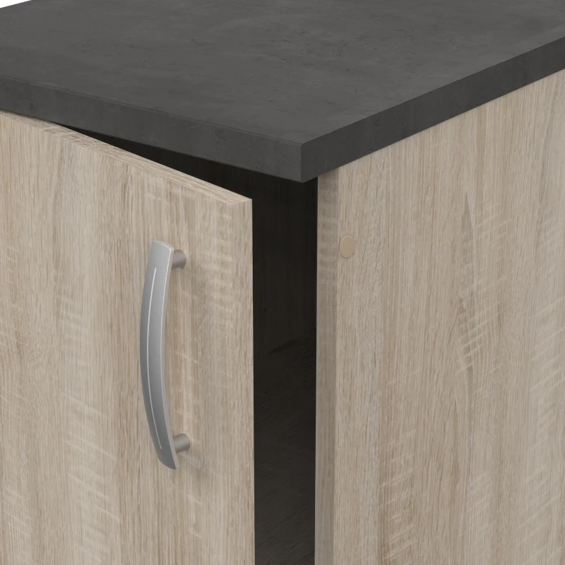 Le coloris chĂŞne brossĂ© s’accorde parfaitement avec le plan de travail coloris gris bĂ©ton.Â