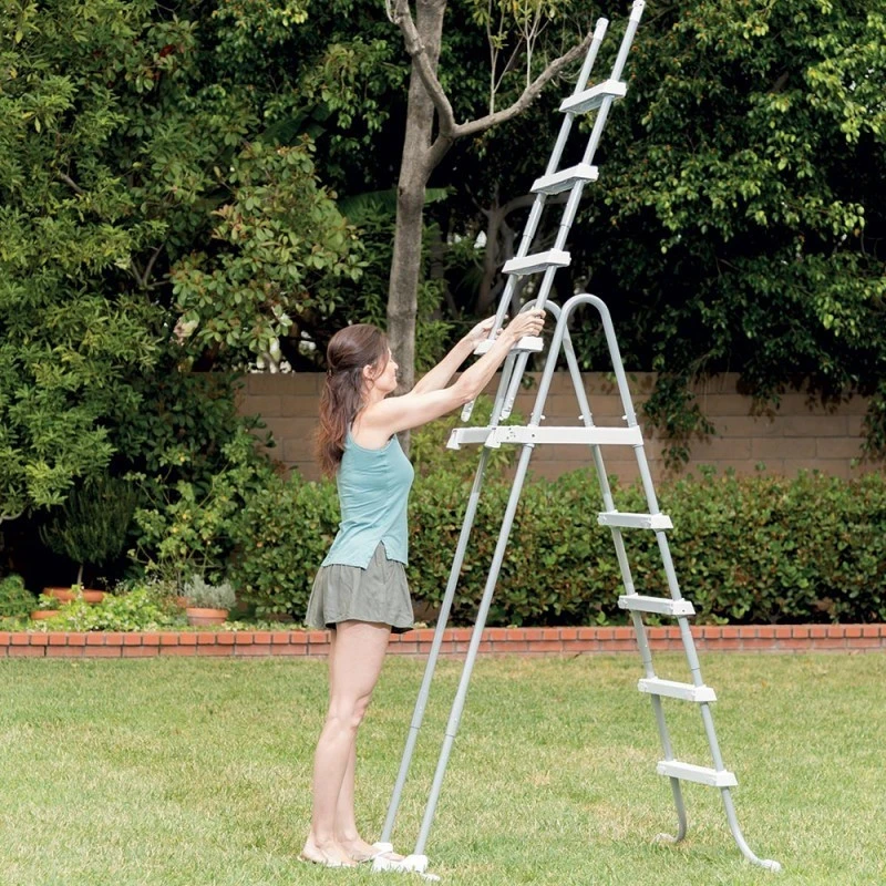 Vous pourrez également simplement lever l’échelle comme sur la photo pour éviter un accès extérieur. Un simple clip et la marche se met ou s’enlève ! Echelle avec plateforme pour plus de confort. Elle est conçue pour les piscines jusqu’à 1,32 m de hauteur.