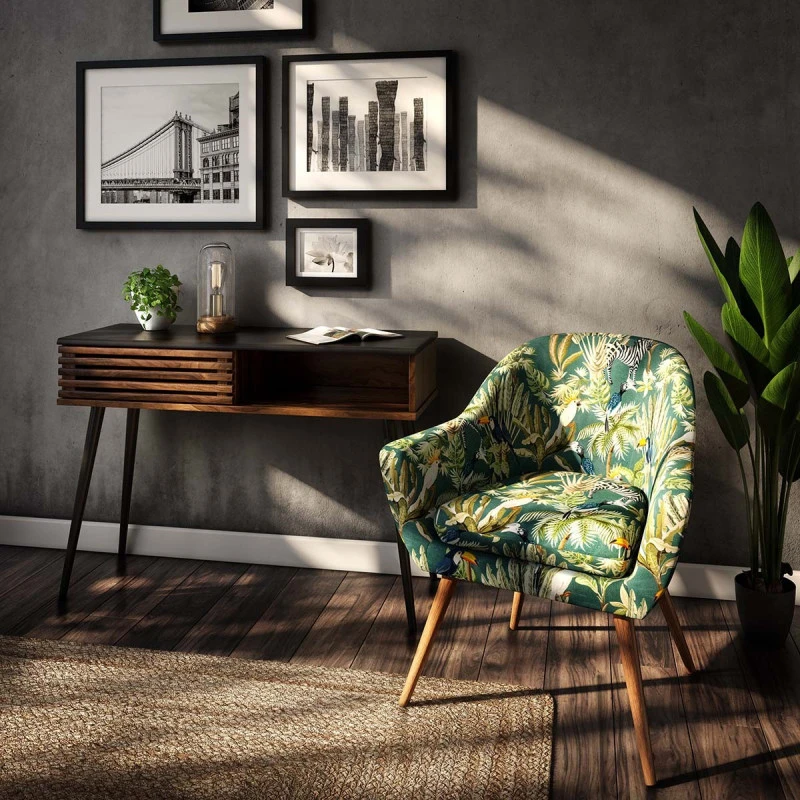 Fauteuil à motifs exotiques de la marque Atmosphera. Pieds en bois à monter soi même.