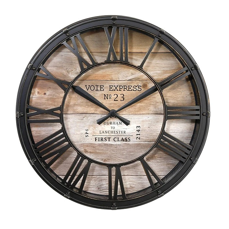 Horloge au style vintage dĂ©corĂ©e par des chiffres romains et des messages peints sur le fond.Â