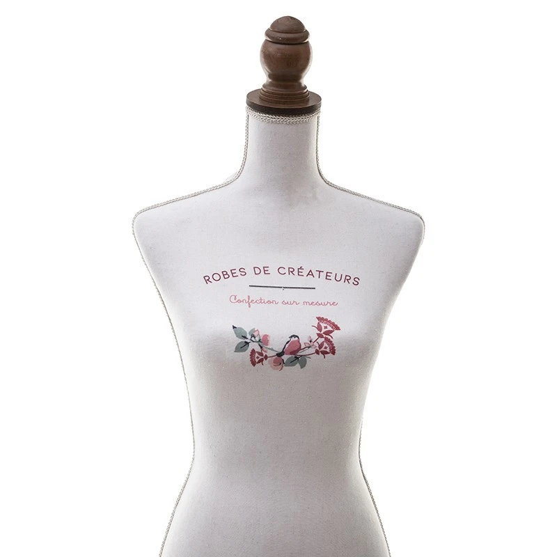 Mannequin de couture de la marque Atmosphera. Ce buste, grandeur nature mesure 160 cm. Sur le devant, on peut lire : « Robes de créateurs » est « Confection sur mesure ». Au dos, le motif est fleuri pour un effet romantique. Très décoratif, les mannequins sont l’objet charme dans une chambre ou un bureau !